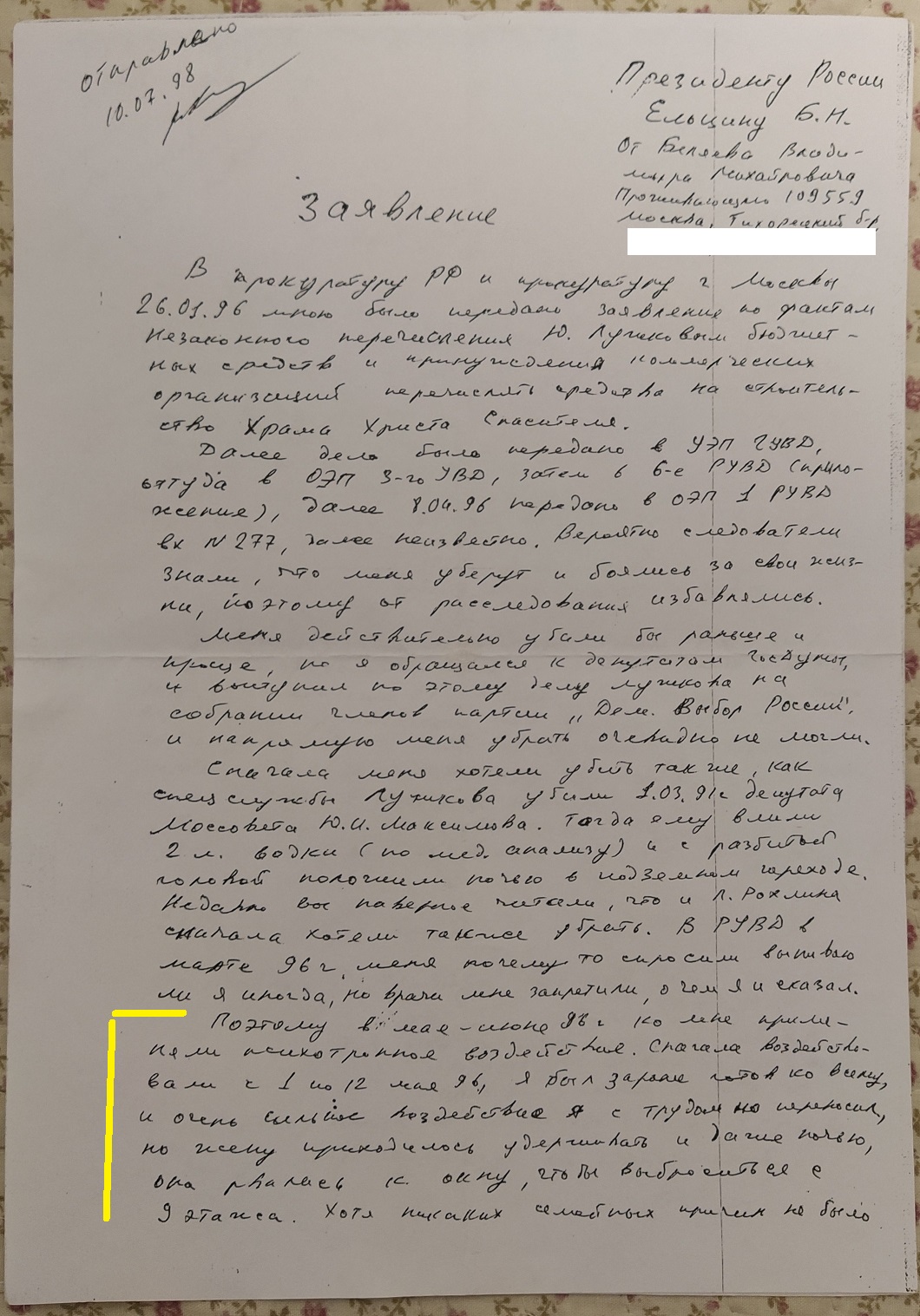 Заявление Президенту России Ельцину Б. Н. от 10.07.98 http://xram-luj.narod.ru/business2.html