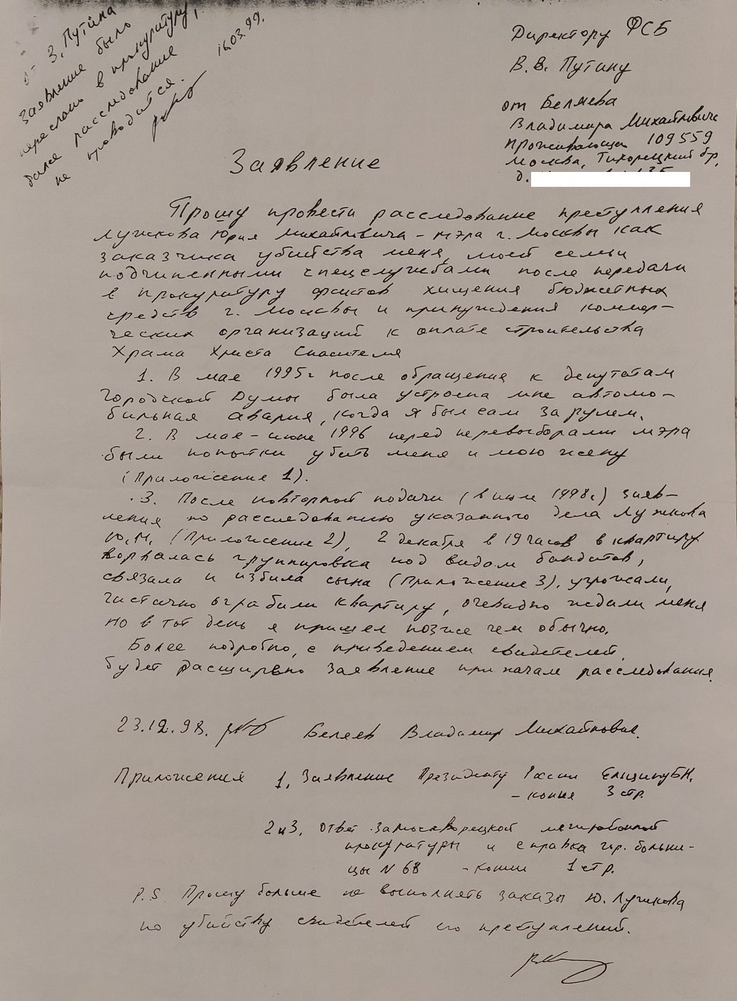 Заявление Директору ФСБ Путину В. В. от 23.12.98 https://xram-luj.narod.ru/business2.html